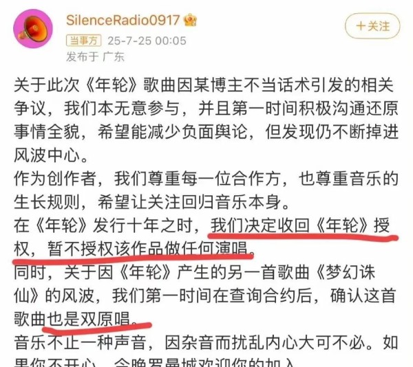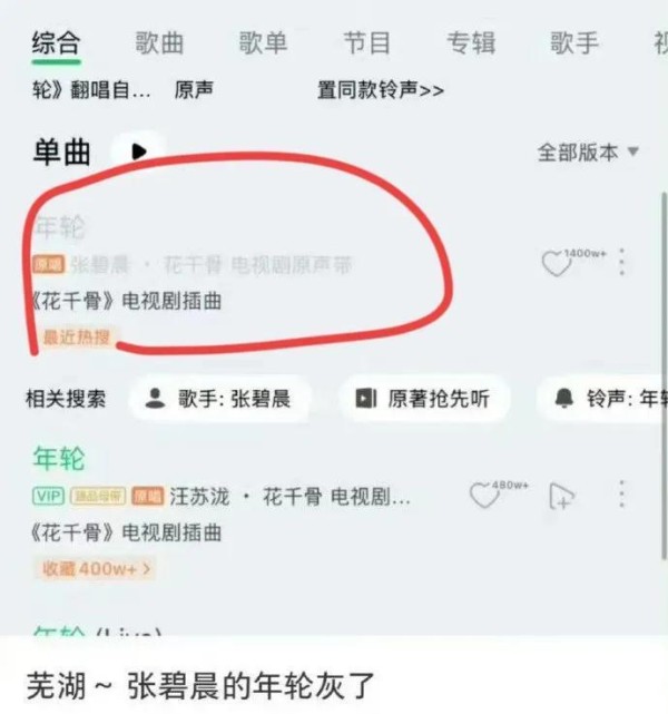 可是从情理上讲,这事儿就复杂了。张碧晨唱《年轮》也不是一天两天了,观众都认为这是她的歌,突然被收回版权,确实有点说不过去。