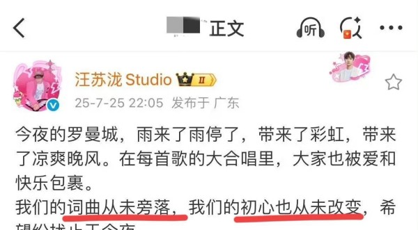 演唱会结束后,汪苏泷又发了条图文,内容是“词曲从未旁落,初心从未改变,望纷扰至于今夜”。意思很明显,就是希望这事儿到此为止,大家都别再闹了。