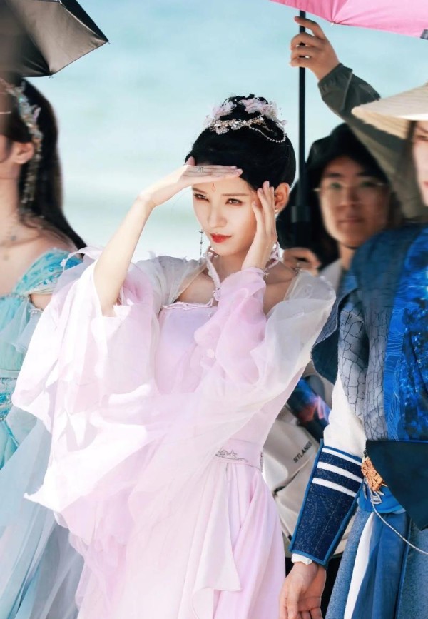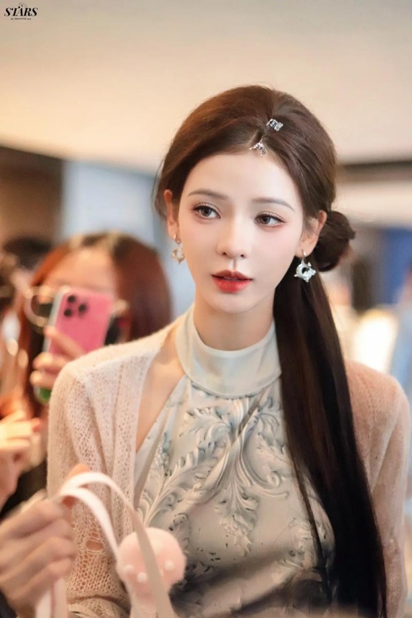 眼妆则走的是"减法美学"路线。不同于红毯常见的亮片、烟熏重妆,张予曦选择浅杏色打底,仅在眼尾用深棕色轻轻晕染出微下垂感,内眼线细到几乎隐形,睫毛根根分明。最绝的是卧蚕处点缀的细闪,颜色精准匹配了礼服上的樱花钻,眼波流转间灵动又不显刻意。唇妆的豆沙调玫瑰色带着微光泽感,既中和了粉裙的华丽,又提升了整体气色。