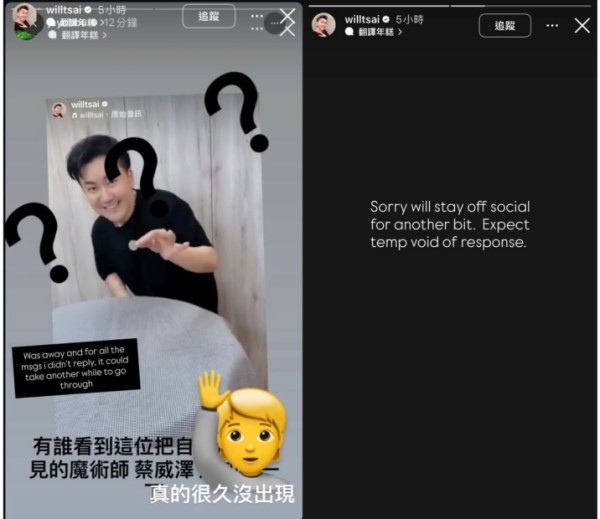 10月16日,据《镜周刊》、《ETtoday星光云》等台媒报道,15日,周杰伦突然在社交平台上连发两文寻人,其贴出蔡威泽社交账号,并配文“有谁看到这位把自己也变不见的魔术师,蔡威泽,通知我一下”。