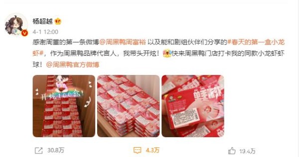 2022年4月1日,周黑鸭官宣杨超越为品牌代言人。在发布的官方宣传海报中,杨超越身着一袭红衣置于粉色背景中,颇为灵动可爱,背景中左上方拿小龙虾的漫画手和她的右手相呼应,完美契合了周黑鸭的“单手吃虾”,同时也塑造了轻松幽默的整体氛围。周黑鸭在官微中配文称:“她「超」会吃小龙虾「越」吃越带劲”,强势推出爆款大单品小龙虾虾球。