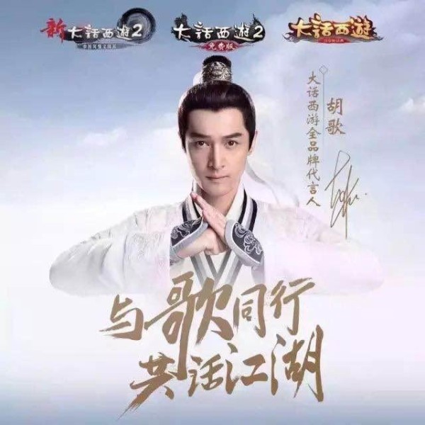 这是大话2前些年的经典代言人,胡歌还曾打扮成飞剑侠的造型出镜。老实说虽然胡歌外形俊逸,但是我对他真的没啥感觉……(这里还请胡歌的粉丝们手下留情)总是觉得他并不太适合这款游戏的风格。当年的他还是一枚小鲜肉,而大话西游2却是一款快意恩仇的江湖侠义网游,虽说他在粉丝中的影响力很高,但是和游戏本身并没有太大的渊源。