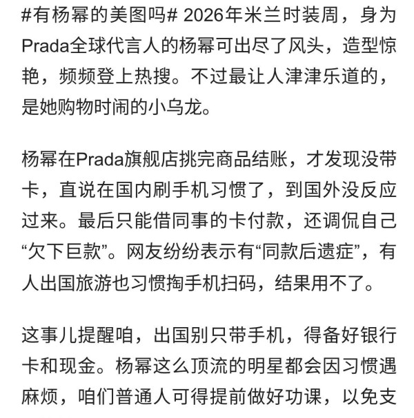 你们有没有想过,一个在米兰Prada旗舰店扫货的女明星,最后结账时居然掏不出银行卡,还得蹭同事的卡刷? 这事儿要是放在普通人身上,可能就是个尴尬的小插曲,但发生在2026年2月底的杨幂身上,却直接炸上了热搜,话题阅读量瞬间破亿。