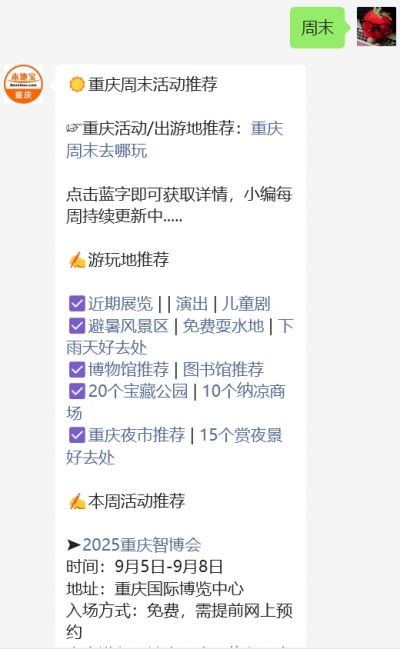 温馨提示:微信搜索公众号【重庆本地宝】,关注后回复【周末】获取重庆周末活动推荐(每周持续更新)、游玩好去处推荐、各景点攻略、特惠门票、免费门票福利等。