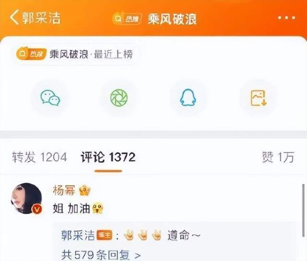 还有郭采洁发微博宣布加盟《乘风破浪》后,热门评论第一名就被杨幂占据。她在底下留言说:“姐,加油”。想想最近这段时间网上传得沸沸扬扬的《小时代5之疫情时代》,人们还真的有一点代入这个剧情里面。