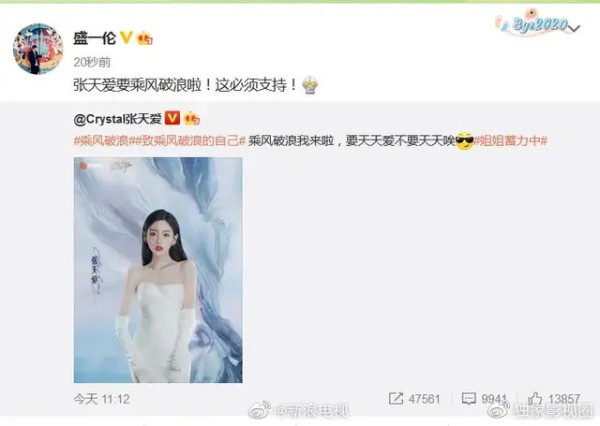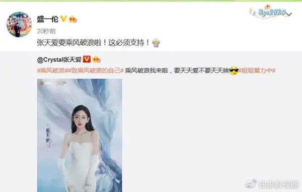 算是爆红网剧的开山鼻祖《太子妃升职记》,全体演员彭昱畅、于朦胧、盛一伦等人转发张天爱此次参加《乘风破浪》的微博。