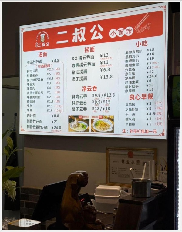 顺德是刘锡贤老家 生活成本远低于香港,加上家乡云吞面手艺情结 两人决定开面馆“泰昌二叔公”。主打竹升云吞面,最受欢迎鲜虾面只要9.9元,两个叉烧包3元 净云吞8元 价格亲民像20年前香港街坊价。