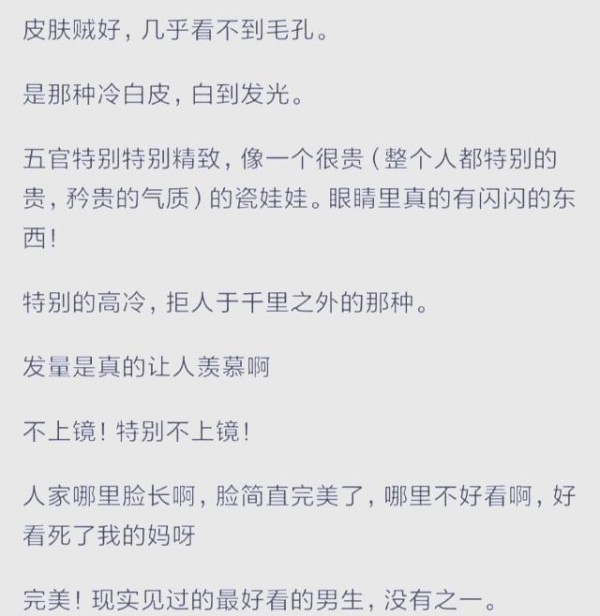 他的皮肤状态极佳,几乎看不到任何毛孔,宛如细腻的瓷器。他的五官精致得如同贵重的瓷娃娃,每一处都透露出高冷的气质,仿佛拒人千里之外。他的发质令人羡慕,乌黑亮丽,但遗憾的是,他并不擅长上镜。尽管如此,他在现实中依然是无可比拟的帅气男生。此外,这位粉丝的描述也代表了众多人对王一博颜值的共同印象。