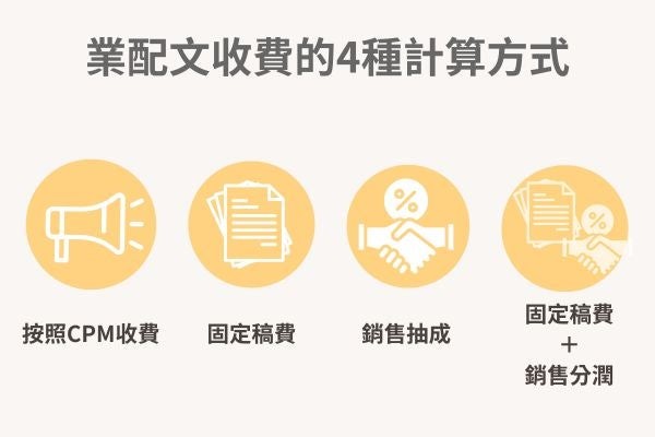 常見的業配文收費方式可分為「按照CPM收費」、「固定稿費」、「銷售抽成」與「固定稿費+銷售分潤」4種方式,以下將為您詳細介紹常見的網紅合作費用計算方式: