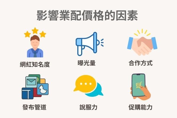 影響KOL業配行情的因素除了粉絲數量、合作方式、業配平台之外,能為品牌帶來更多的曝光量、能有效呈現商品功能與優勢,以及擁有優良促購能力的網紅收費也會更高,以下將為您介紹影響業配價格的因素: