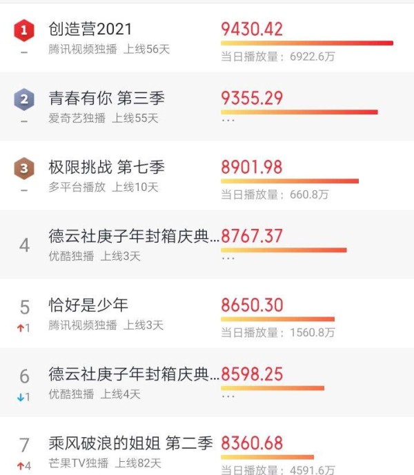 最新综艺节目排行榜:《创造营2021》夺冠,《王牌对王牌》已掉线