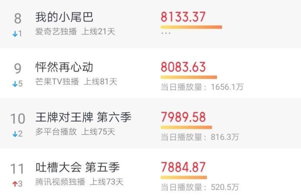 而另一档王牌节目《王牌对王牌》第六季,因为已经收官的原因,目前在综艺节目排行榜上面,只能排到第十名。