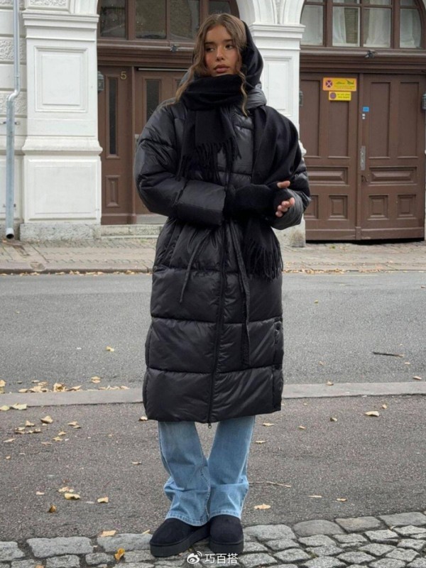 这里需要提醒大家一下,为了保证整体造型轻盈耐看,大家尽可能选择不同色的搭配方式,黑色长款羽绒服搭配蓝色窄版牛仔裤效果最佳,同为低饱和度色系,既有共性又有个性,日常外出又暖又洋气。