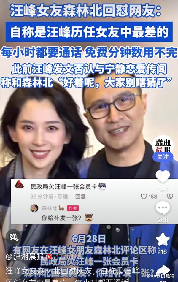 最近明星情侣圈真是不缺瓜!汪峰新女友森林北昨天突然在社交平台开怼网友,甩出一句"我是汪峰历任女友里最差的",直接把#汪峰女友回应争议# 送上热搜。更让人惊掉下巴的是,她还爆料两人"每小时都要通话",这波操作看得人一脸问号——到底是真性情发言还是另有玄机?咱今天就来扒一扒。