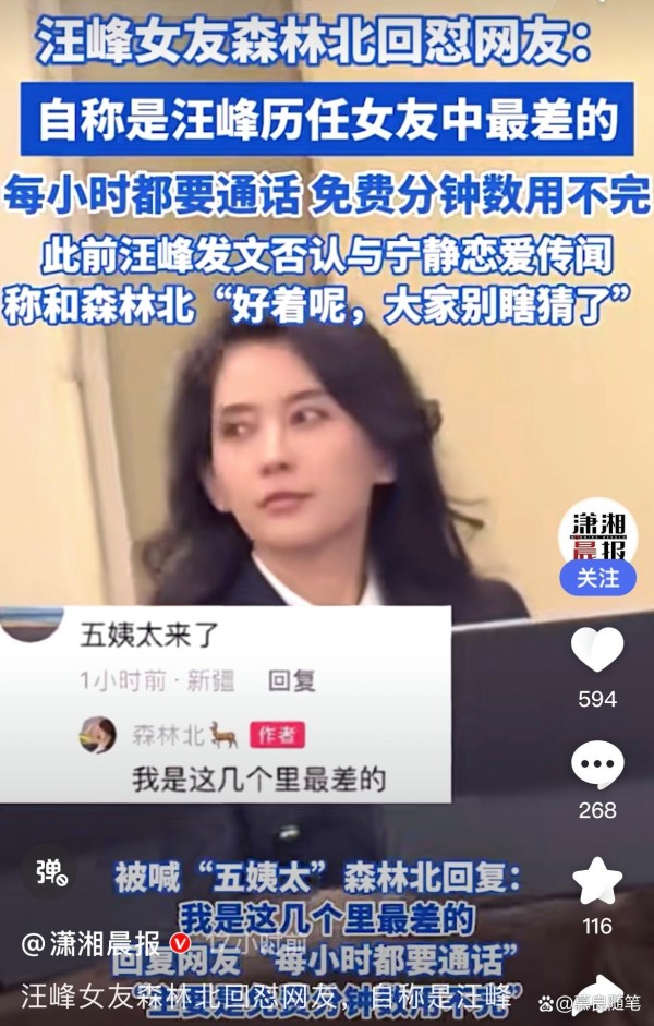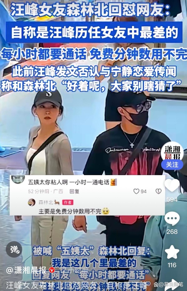 但更多人觉得这波操作"太刻意":"说自己最差,其实是变相夸汪峰不嫌弃她""每小时通话听起来甜蜜,实则暴露控制欲"。有营销号分析,森林北自从和汪峰恋爱后,账号流量暴涨10倍,这次回怼很可能是团队策划的"争议营销",毕竟在娱乐圈,没话题才是最可怕的。
