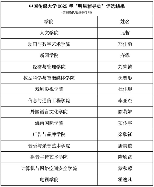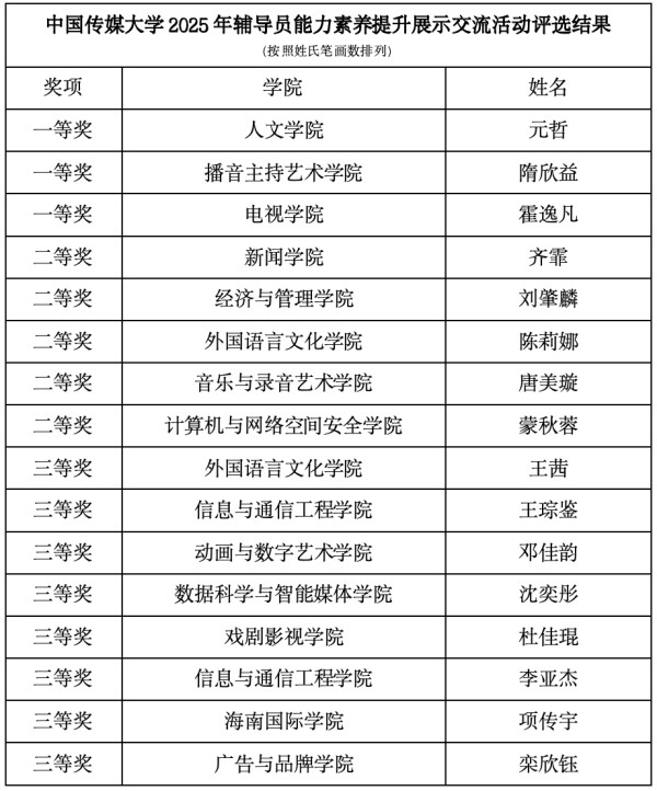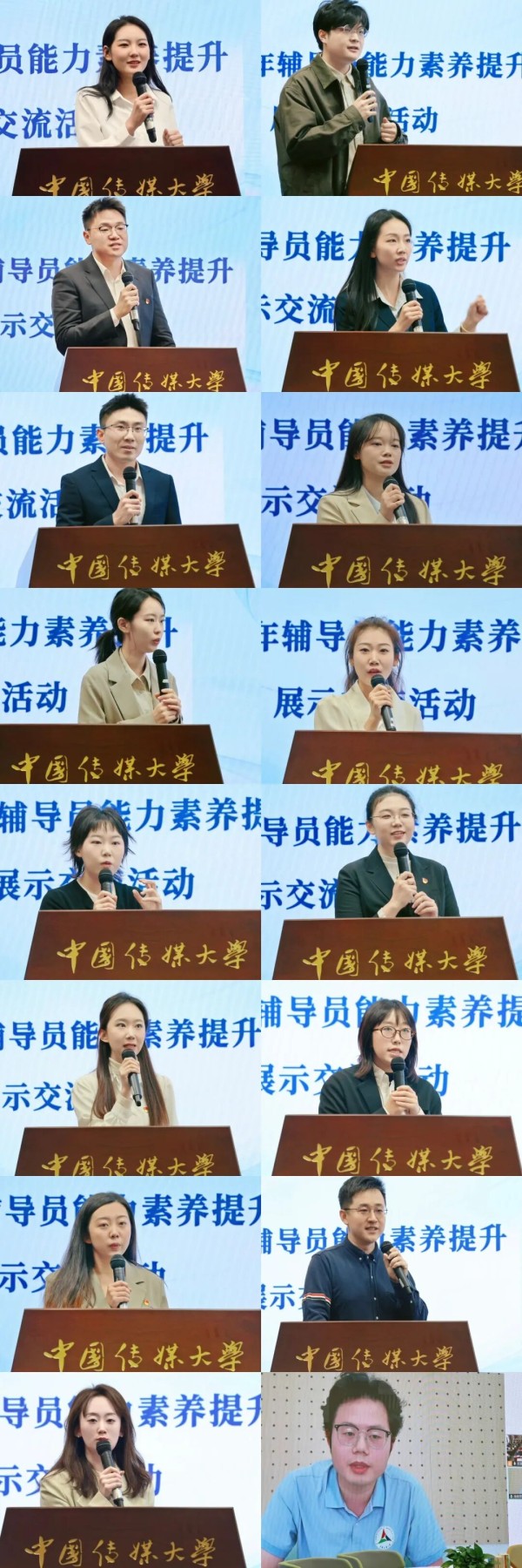 在此基础上,活动综合个人申报、学院推荐、学生评议及本次能力素养提升展示交流活动成绩等多项指标,最终评选出14名辅导员授予中国传媒大学2025年“明星辅导员”称号。