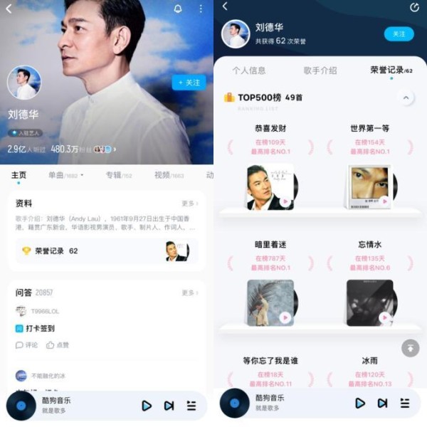据酷狗音乐APP刘德华个人主页可见,已经有超过2.9亿人听过其歌曲,且收听人数仍在上涨中。不少歌迷在酷狗音乐“刘德华”单曲评论区留言道:“一直追随着华仔的脚步。加油华仔!我永远的偶像”。“小时候的偶像,现在依然是我的偶像。有刘德华陪伴的青春不会寂寞。”