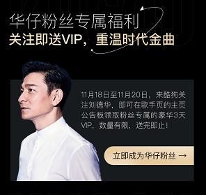 11月18日至11月20日,上酷狗音乐搜索“刘德华”,进入演唱会活动专题页面,关注@刘德华 酷狗音乐官方账号,即可在歌手页领取粉丝专属豪华3天VIP,数量有限,送完即止。