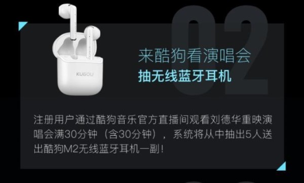 福利三:来酷狗音乐看演唱会 抽蓝牙耳机11月20日晚,注册登录用户通过酷狗音乐官方直播间观看刘德华演唱会重映满30分钟,系统将从中抽出5人送出酷狗M2无线蓝牙耳机一副!