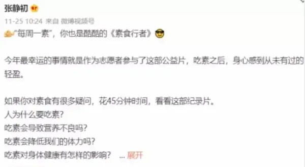 这种宛如江湖骗子一般的发言,出自张静初参与拍摄的纪录片《素食行者》,并被她当做微博文案宣传转发。