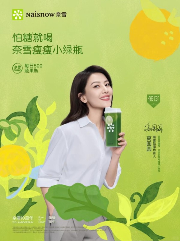 高圆圆力荐!奈雪瘦瘦小绿瓶成“娱乐圈健康委员”官宣!高圆圆代言奈雪,携行业首款低GI蔬果茶诠释健康生活