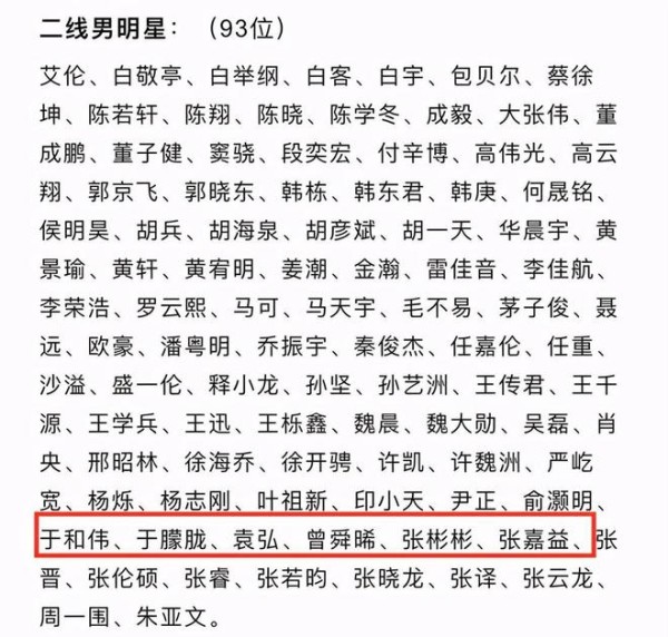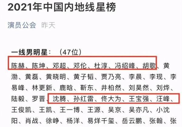 一线明星名单 演员工会发布内地一线男女明星名单太离谱!2021年内地线星榜曝光,陈赫汪峰成一线男星引争议