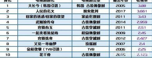 去年大火的电视剧《人民的名义》创造了尘封多年的电视剧记录,但是,并没有打破当年引进的韩剧《大长今》的记录,大长今以平均收视率3.88高居榜首,按照数据推算,当年这部剧大概垄断了50%的份额。