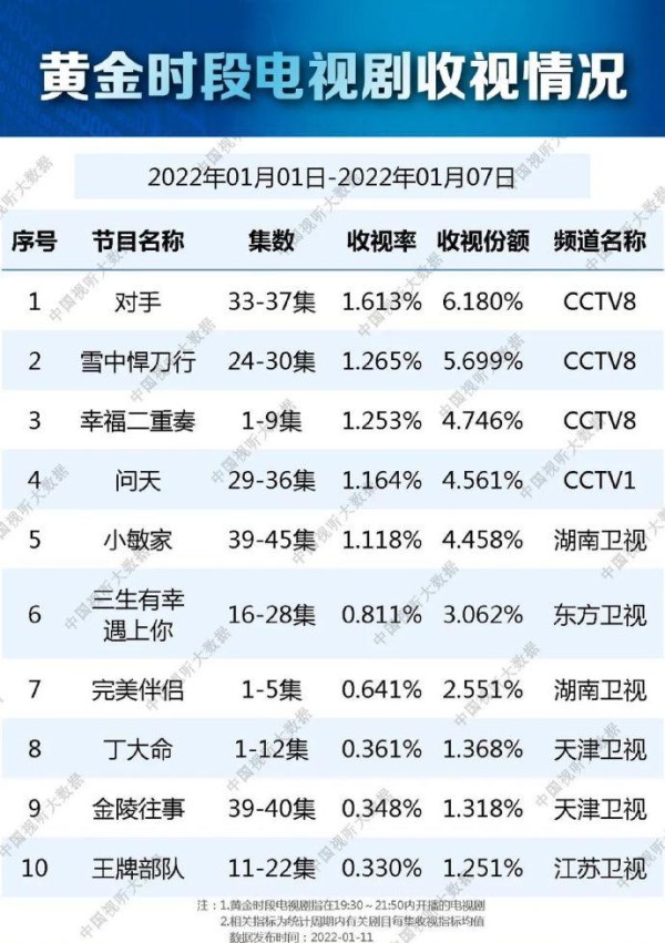 1月11日傍晚,总局的中国视听大数据公布最新一期的黄金时段电视剧收视情况。这次的数据区间是1月1日到1月7日。在这一数据区间当中,新开播的电视剧包括《幸福二重奏》、《完美伴侣》和《丁大命》等作品。收视率成绩方面,最令人意外的,则是天津卫视正在播出状态当中的《丁大命》,虽然该剧早已在地面频道播出过,但依旧成绩喜人。