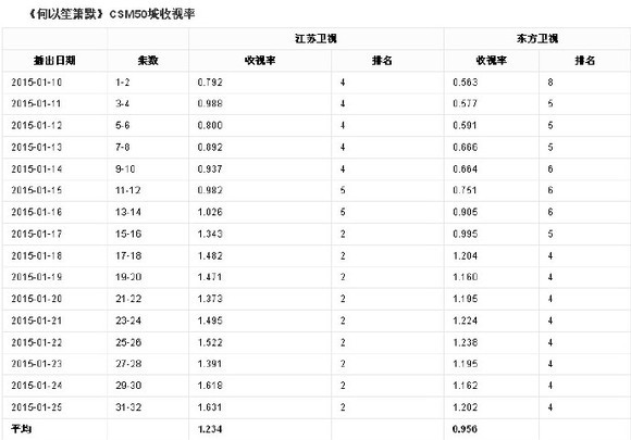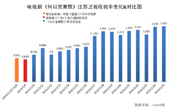 《何以笙箫默》于2015年1月10日在江苏卫视、东方卫视双台开播。作为广电新规定下第一部双星、双集联播的电视剧,一方面失去了传统的电视剧三集联播时期第三集收视惯性拉高收视率的优势,另一方面因播出平台收视处于低迷期(接档剧的大结局收视分别为0.65和0.62),故而《何以》面临的收视压力不小。《何以》播出伊始,正值走势强劲的《老农X》剧情进入高潮,并全程正面迎战超高收视且已拥有稳固收视群的古装长剧《XXX传奇》,同时开播时间全程对撞学生考试月……播出条件存在诸多劣势。