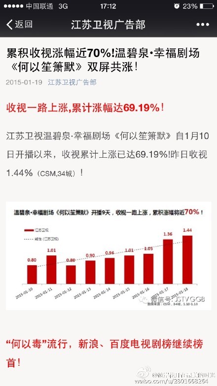 自《何以笙箫默》开播之日起,双台收视一路攀升、捷报频传。最终,全剧以江苏卫视平均收视1.234(CSM50城),单集最高达1.833、东方卫视平均收视0.953(CSM50城),单集最高达1.383的成绩完美收官。值得注意的是,本剧助力东方卫视、江苏卫视黄金剧场收视大幅上涨,重焕生机。其中东方卫视剧场平均收视在何以期间涨幅近50%,而江苏卫视幸福剧场平均收视提升达70%!为广电新规下的“双星双集联播电视剧”成绩首页写下漂亮的一笔。