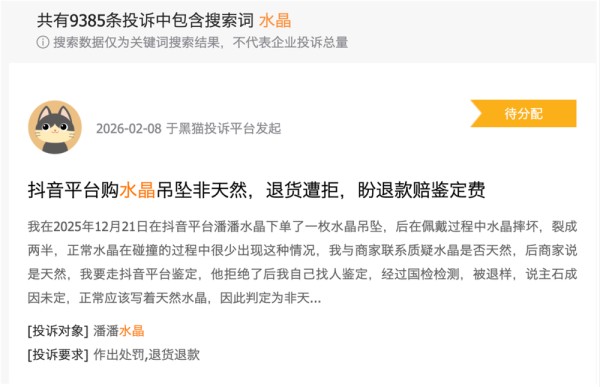 然而,繁荣之下,乱象已生。在消费者投诉平台黑猫上,“水晶”词条下有9385条消费者投诉。其中,水晶造假、材质不符、产品瑕疵、售后问题、退款难等问题都成为消费者投诉的重灾区。