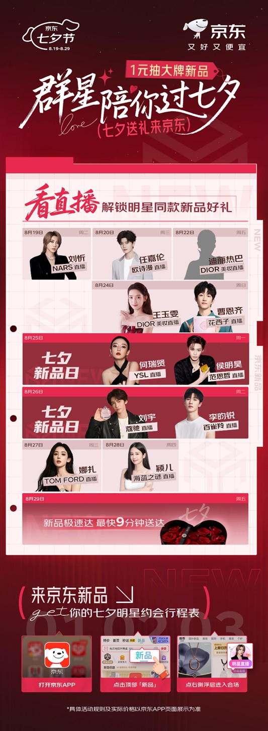 同时,为给消费者的浪漫表白增添更多仪式感,今年京东七夕节还联合众多品牌及明星推出多项惊喜活动。活动期间,消费者使用京东“一键送礼”功能,不仅可以享受送礼优惠,还能解锁张艺兴、杨紫等明星的七夕祝福贺卡,更有机会以0.01元购得京东×MCM独家联名帆布袋。此外,刘忻、任嘉伦、迪丽热巴等多位明星也将在京东七夕节期间在京东直播间开设“明星恋爱课堂”,为消费者带来恋爱、送礼小妙招,观看京东直播还有机会1元获明星同款与周边福利。