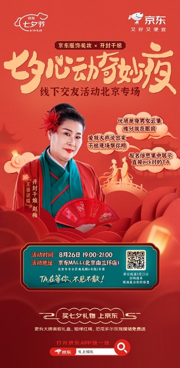 8月26日晚上七点,京东服饰美妆还将联合京东MALL,携手开封交友栏目《王婆说媒》主持人赵梅,在京东MALL北京南三环店打造“心动奇妙夜”线下交友专场, 为广大单身青年们提供一个与心动伴侣相遇的机会。现场参与活动还有机会获得厄瓜多尔玫瑰、美妆礼盒、姻缘红绳等精美礼品。