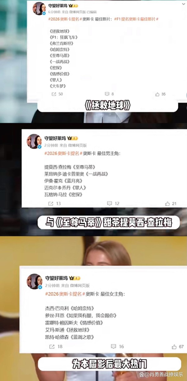 特大好消息!2026奥斯卡提名名单释出,幸好没有肖战?