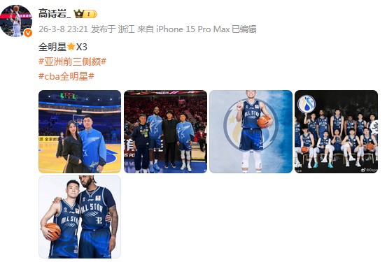 高诗岩更新社媒发文:全明星X3,亚洲前三的侧颜。