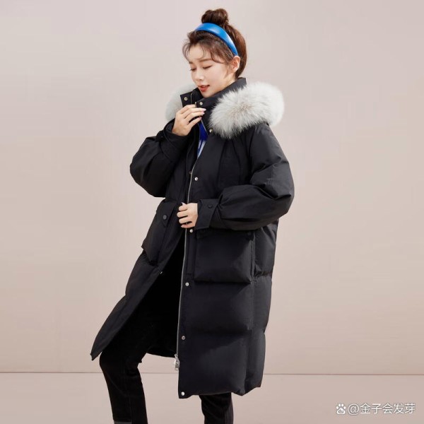 这款羽绒服采用中长款剪裁,线条流畅利落,既能修饰身形又具备良好的包裹感。黑色主色调经典耐看,搭配白色狐狸毛领形成鲜明对比,视觉层次丰富,无论单穿还是叠搭都极具存在感,轻松提升整体造型质感。