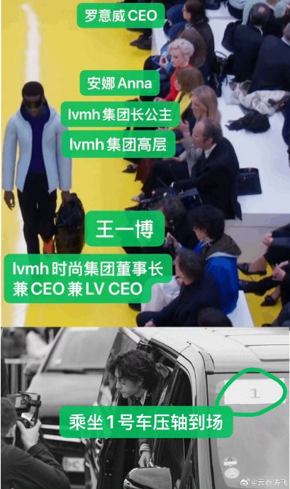王一秀场内座位进一步强化了1号车的象征意义。他被安排在LVMH集团时装部CEO与集团长公主Delphine Arnault之间,形成“顶级权力三角区”: