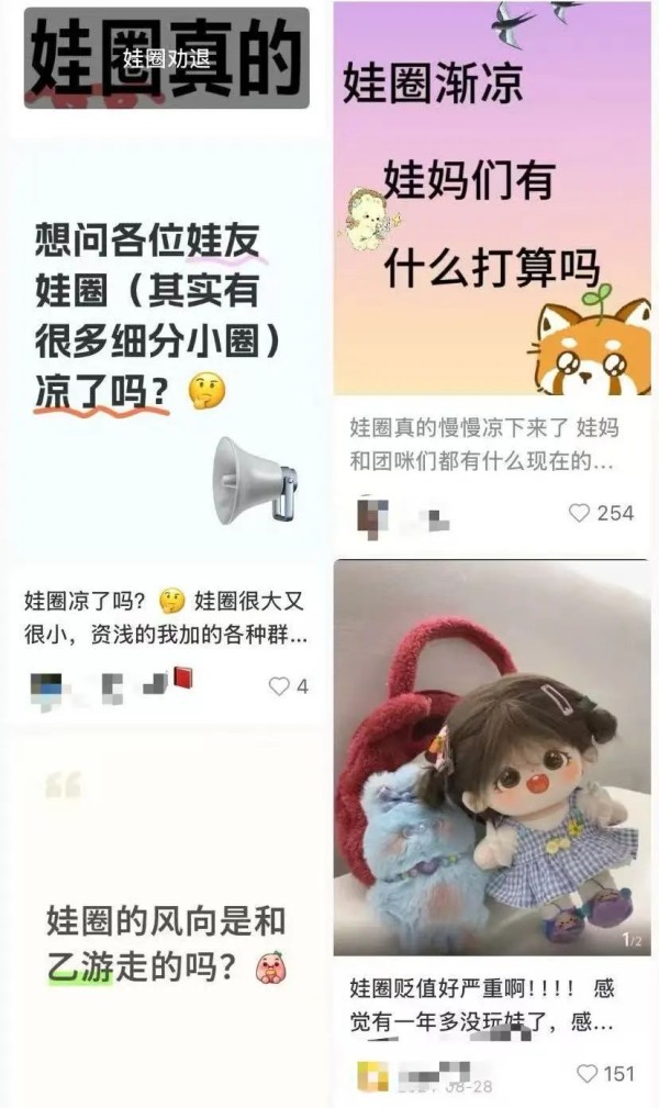 近两年,棉花娃娃虽然从“野蛮生长”转向“品牌化运营”,但由于明星的塌方、出品方品控不足、低龄化趋势等因素,IP向棉花娃娃的市场显然已经不再“高歌猛进”。社交媒体上也出现“娃圈凉了”的唱衰信号,不少娃圈老粉纷纷退圈。