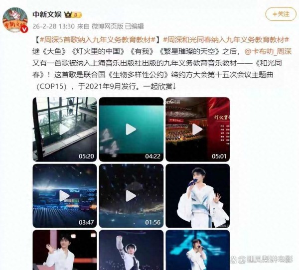 2026年三月,娱乐圈又被刷了一波大新闻:央媒直接发话,周深的《大鱼》《和光同春》等五首作品火速空降九年义务教育音乐课堂——不是“建议听一听”,是切切实实进课本那种。老师会在课上讲,学生还得跟着学唱。这可是头一回,国家真的把一位活跃在舞台上的当代流行歌手当成正儿八经的教育资源。原因也很现实:歌词健康真挚、编曲走心不“土嗨”,比起那些三句不离“爱你一万年”的老情歌,简直清流。