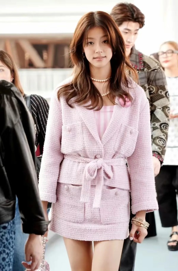 她穿着粉色花呢套装,手上挽着亮片手袋,棕色卷发自然地垂着,模样精致,浑身透着高级感。站在一群大明星边上,她特别自信,特别亮眼。外媒拍的照片一出来,就在时尚媒体上到处传,人气一下子就涨起来了。
