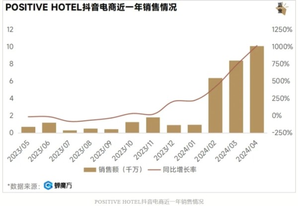 看数据,2023年一年,抖音电商一侧POSITIVE HOTEL营收也只有1~2.5亿元,而2024年仅仅4个月,就超过了2023年的全年。