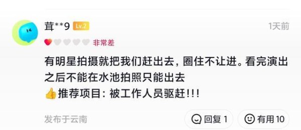 据西双版纳热带花卉园官方商家信息中显示,该景区为收费景区,门票定价明确:成人票40元/人,老人、儿童及学生可享受半价优惠,每张20元,一大一小套票则为60元。值得注意的是,在该景区已售门票的评论区,有多名游客于3月8日留下差评,反映类似问题。有游客称,“有明星拍摄就把我们赶出去,圈住不让进,看完演出之后不能在水池拍照只能出去”;还有游客表示,自己本是冲着景区表演前往,结果表演临时取消却未收到任何通知,体验感极差。