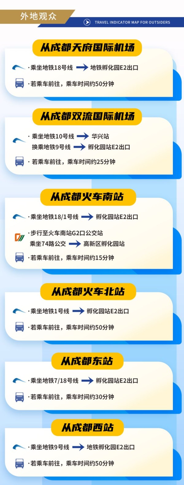 场馆目前不提供停车服务,自驾的朋友请将车开往附近的环球中心、成都SKP、招商商场、锦城万达广场或IN99等周边商场停车,然后步行或者使用共享单车到达场馆东南门入场。
