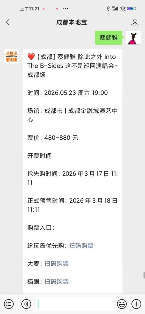 温馨提示:微信搜索公众号【成都本地宝】,关注后回复【蔡健雅】直达蔡健雅成都演唱会官方购票入口(含二次开票最新消息),查看演唱会时间、地点、票价等消息,还有退换规则、交通观演和入场指南、热门答疑等。