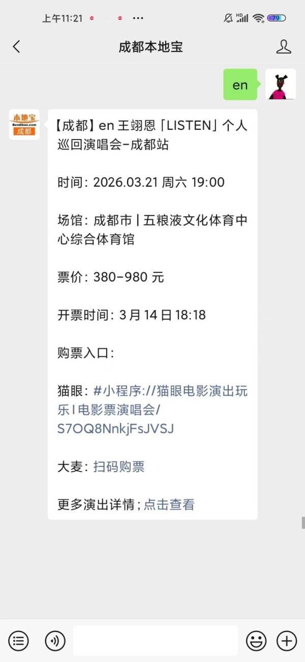 温馨提示:微信搜索公众号【成都本地宝】,关注后回复【en】直达en成都演唱会官方购票入口(含二次开票最新消息),查看演唱会时间、地点、票价等消息,还有退换规则、交通观演和入场指南、热门答疑等。