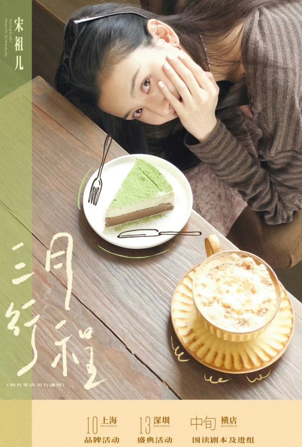 再来看一下宋祖儿的3月10日在上海有品牌活动,3月13日在深圳有盛典活动,三月中旬在横店围读剧本及进组。
