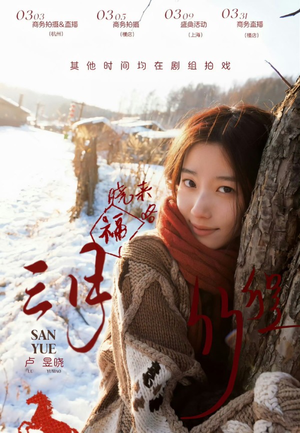 接着来看卢昱晓的,3月3日在杭州有商务拍摄和直播,3月5日在横店商务拍摄,3月9日在上海有盛典活动,3月31日在横店有商务直播,其余时间均在剧组拍戏《何不同舟渡》。