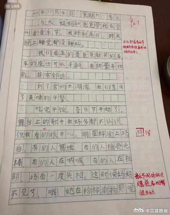 小学生作文记录梓渝音乐节盛况,妈妈拍照忘我