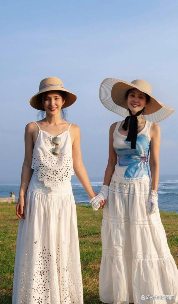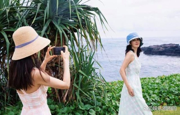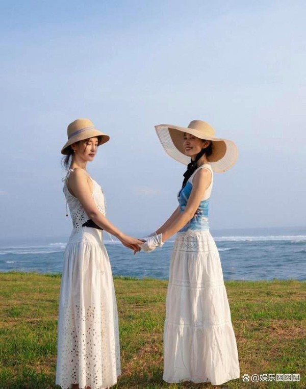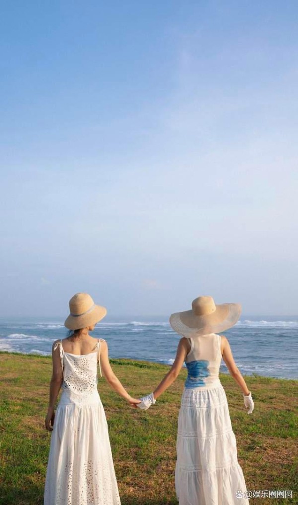 两人宛若双生花一样,在海边拍摄合照,她们难得一起出去度假,自然是要好好享受惬意时光。