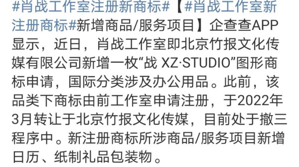 肖战工作室模式凸显了商业自主权与内容话语权的双重诉求。北京竹报文化传媒有限公司不仅承接了肖战的全面经纪业务,更将“战XZ·STUDIO”图形商标全部收入囊中。这种从“表演者”到“资本主体”的身份跃迁,让艺人真正掌握了选剧权、商务谈判主导权和团队建设决策权。